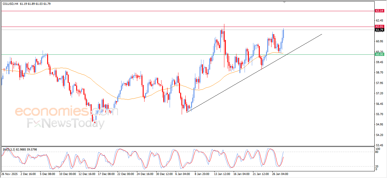 Der Rohölpreis setzte seine Gewinne im letzten Handelstag fort und bereitete sich darauf vor, das in unserer vorherigen Analyse prognostizierte Ziel bei der wichtigen Widerstandsmarke von 62,00 US-Dollar anzugreifen. Dies geschah vor dem Hintergrund der anhaltenden Aufwärtsunterstützung durch den Handel über dem EMA50, dem Auftreten positiver Signale von Relative-Stärke-Indikatoren sowie den Bewegungen entlang einer kurzfristigen Aufwärtstrendlinie.