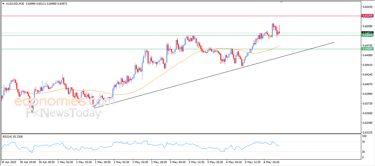 Der (AUDUSD)-Preis war im jüngsten Intraday-Handel Schwankungen unterworfen, um dann wieder abzufallen und seine frühen Verluste auszugleichen, während er versuchte, eine positive Dynamik zu gewinnen, die ihm zu einer Erholung und einem erneuten Anstieg verhelfen könnte. Trotz dieses Rückgangs blieb der Preis stabil über 0,6490 und bestätigte damit das Durchbrechen dieses kritischen Widerstands, während der Haupttrend nach oben dominierte und er entlang einer Vorwärtslinie gehandelt wurde, mit dem Aufkommen der positiven Signale auf dem (RSI), nachdem es ihm gelungen war, seine überkauften Bedingungen abzubauen und so den Weg für eine neue Aufwärtswelle zu ebnen.
