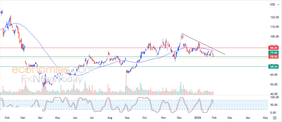 Daher erwarten wir, dass der Aktienkurs im kommenden Handel fallen wird, insbesondere wenn er unter die wichtige Unterstützungsmarke von 79,00 $ fällt, und dass er die nächste Unterstützung bei 68,55 $ anvisiert.
