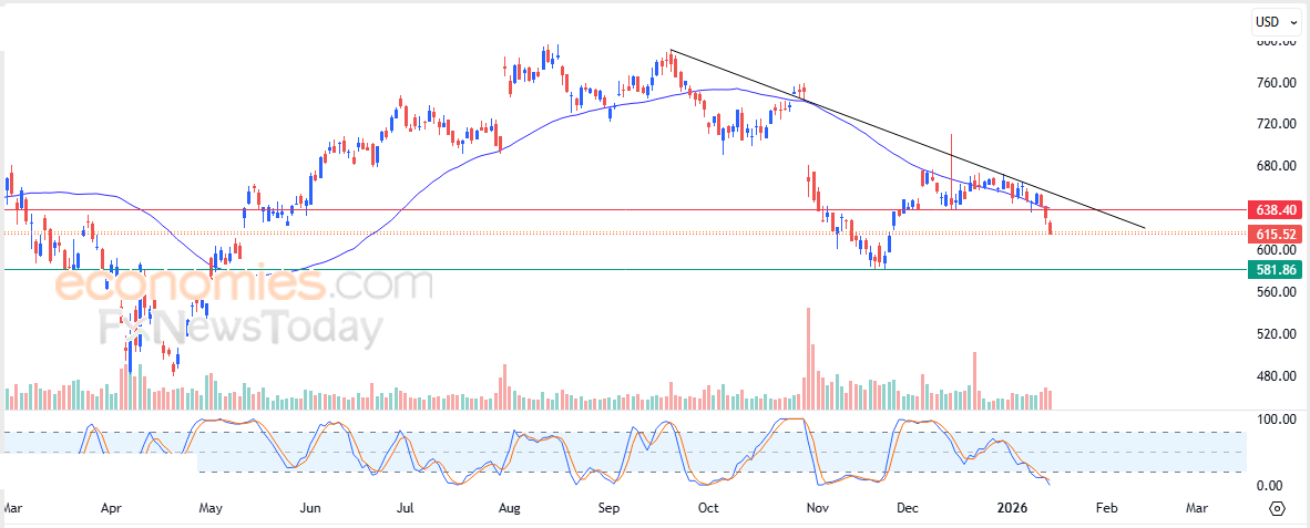 Daher gehen wir davon aus, dass der Aktienkurs im kommenden Handel fallen wird, solange er sich stabil unterhalb des Widerstandsniveaus von 638,40 $ hält, und dass er die wichtige Unterstützung bei 581,85 $ ansteuern wird.