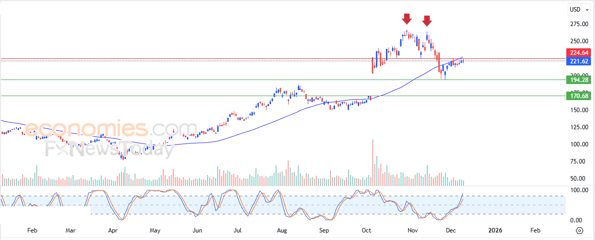 Daher gehen wir davon aus, dass die Aktie im kommenden Handel fallen wird, solange der Widerstand bei 224,65 $ bestehen bleibt, mit dem Ziel, die erste Unterstützung bei 194,30 $ zu erreichen.